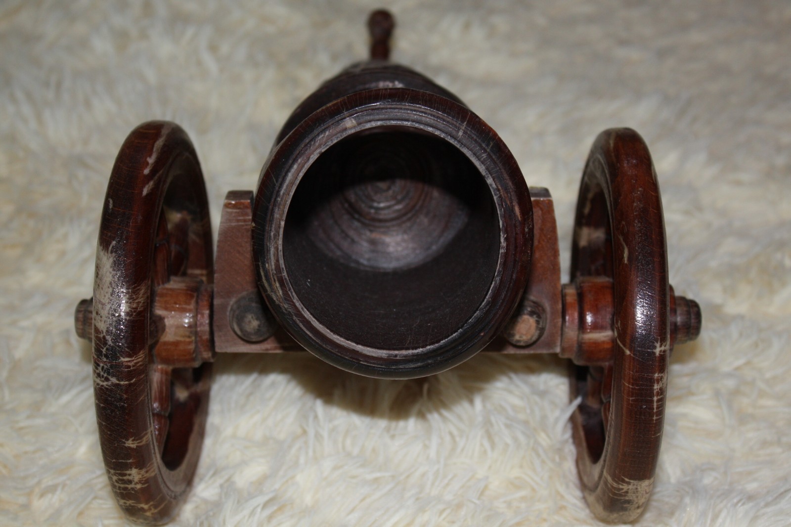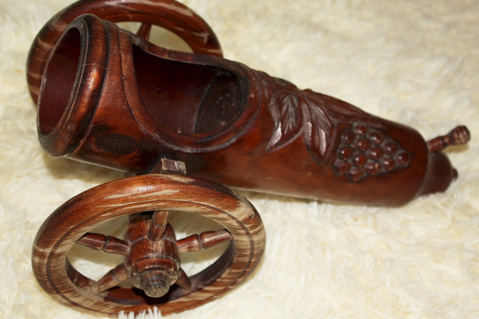 This is a great piece of decor for the man carve! Made in Romania this carved wooden cannon is sure to be a conversation piece. Standing 8″ tall, 10″ wide and 14″ long it features decorative carving grape along the barrel, wheels that roll and can be detachable. This piece is in great vintage condition with just a few some tiny wood cracks scuffs and scratches, which I think adds to the vintage look.