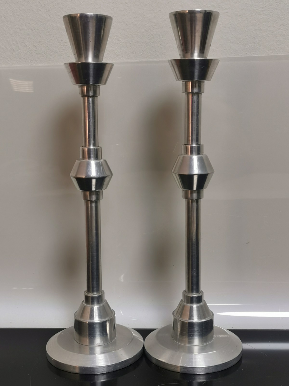 The product is a pair of vintage European aluminium candle holders, designed in a modern style. These candlesticks add a touch of elegance and sophistication to any space, whether used for religious or decorative purposes. The sleek aluminium material gives them a contemporary feel, while their vintage design adds a timeless charm. Perfect for adding a warm and inviting ambiance to any room.
